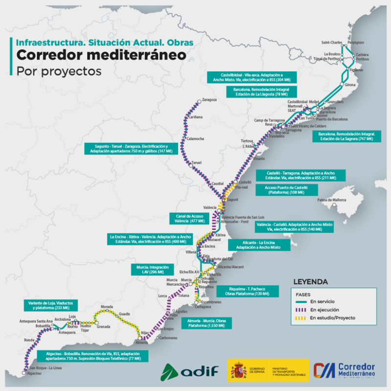 El Corredor Mediterráneo es una doble plataforma de ancho internacional que discurrirá desde la frontera francesa hasta Algeciras, uniendo ciudades tan importantes como Barcelona, Valencia, Alicante, Murcia y Málaga, conectándolas a su vez con el resto de Europa.