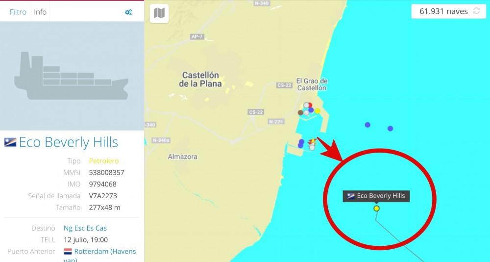 El Eco Beverly Hills es un petrolero de 277 metros de eslora (longitud), 48 metros de manga (ancho) y 15 metros de calado (profundidad de su estructura bajo el agua) que se encuentra fondeado en aguas de Castelló, fuera del Puerto.