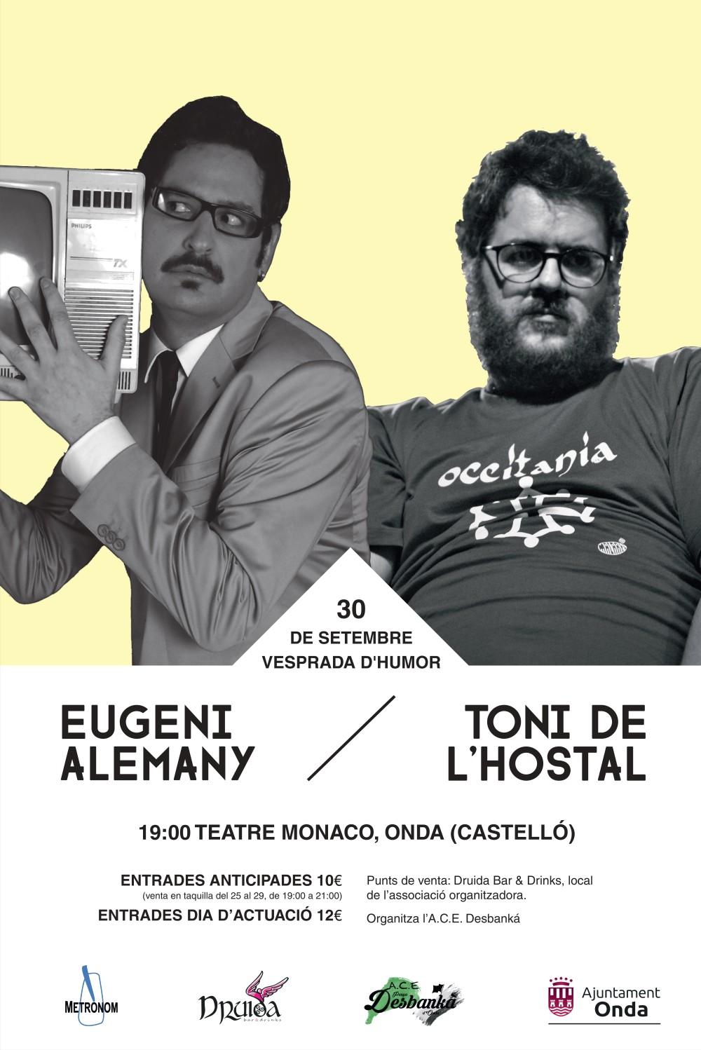 Els còmics valencians Eugeni Alemany i Toni de l’Hostal presentaran a Onda un espectacle que farà a l'espectador passar una vesprada molt divertida. Les entrades ja poden adquirir-se a 'Druida Bar & Drinks' i al local de l'associació Desbankà (situat al carrer Cervantes) a un preu de 10 euros. També es podran comprar a 10 euros en les taquilles del Mònaco de forma anticipada, del 25 al 29 de setembre, de 19 a 21 hores. Finalment, les entrades es podran comprar el mateix dia de l'actuació, a les taquilles del Teatre Mònaco, a partir de les 18 hores, a un preu de 12 euros.