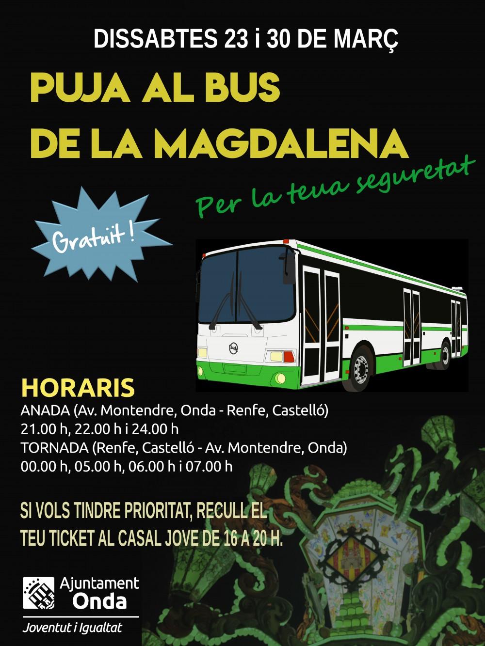 L'Ajuntament d'Onda ha posat en marxa, per quart any consecutiu, un dispositiu gratuït d'autobús amb destinació a les festes de la Magdalena de Castelló que es dispensarà els dissabtes 23 i 30 de març. El regidor de Joventut i Festes, Asensio Blaya, ha explicat que, “després de l'èxit d'aquest iniciativa els anys anteriors, tornem a habilitar aquest servei amb la finalitat de donar l'opció als onders, especialment als més joves, de poder gaudir de la Magdalena sense necessitat d'agafar el cotxe, evitant així riscos en els trasllats. L'objectiu és que els desplaçaments es facen amb tranquil·litat i seguretat, deixant el cotxe a casa per a eixir de festa”.