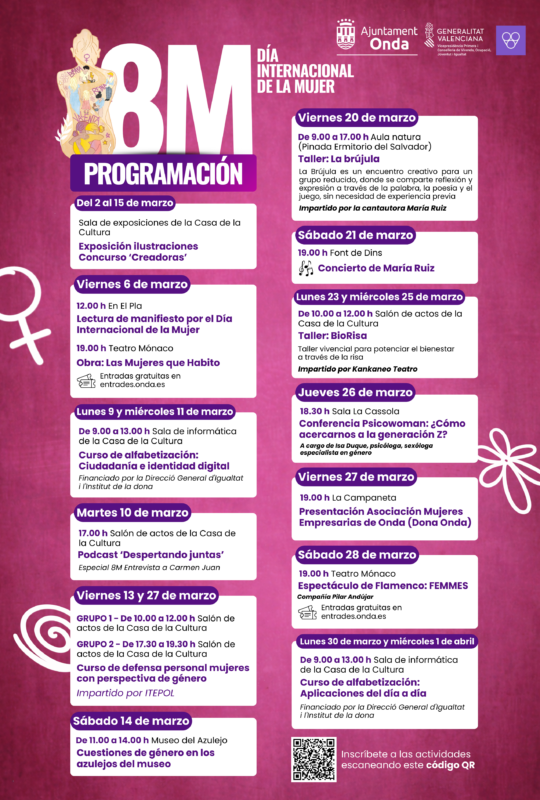 Entre las propuestas programadas sobresalen la lectura del manifiesto institucional con motivo del Día Internacional de la Mujer; espectáculos de teatro y danza como 'Todas las mujeres que habito' y 'FEMMES'; el concierto de la cantautora María Ruiz en la Font de Dins, que también dirigirá el encuentro creativo con enfoque de género 'La Brújula'; el podcast 'Despertando juntas' dedica un programa especial a una entrevista en profundidad con Carme Juan; cursos de defensa personal dirigidos a mujeres; talleres de bienestar emocional como BioRisa; charlas educativas a cargo de Psico Woman; acciones formativas en alfabetización digital; y la presentación oficial de la nueva Asociación de Mujeres Emprendedoras y Empresarias de Onda.