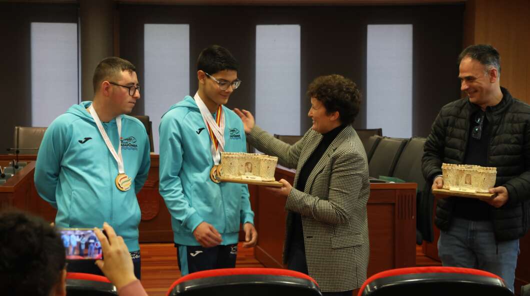 La alcaldesa de Onda, acompañada por el concejal de deportes, José Vicente Iserte, ha recibido a Manuel Fernández y Marc Gómez del Club d'Esports Adaptats tras su triunfo en el Campeonato de la Federación Española de Deportes para personas con Discapacidad Intelectual (FEDDI).