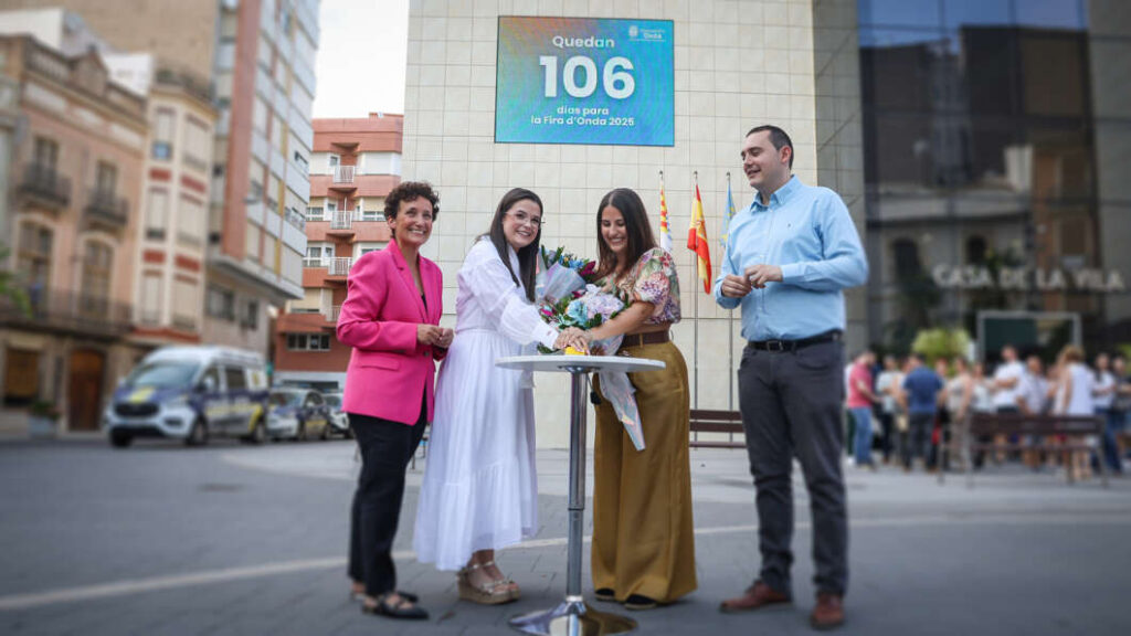 Al finalizar el acto, se ha hecho entrega de un ramo de flores a ambas jóvenes y se ha brindado por una Fira que, un año más, volverá a unir emoción y tradición. Como colofón, Inés, Paula, la alcaldesa y el concejal de Fiestas, Sergio Puig, han pulsado juntos el botón que ha activado la cuenta atrás oficial en la pantalla exterior del Ayuntamiento, señalando ya los días que faltan para que arranque la Fira d'Onda 2025.