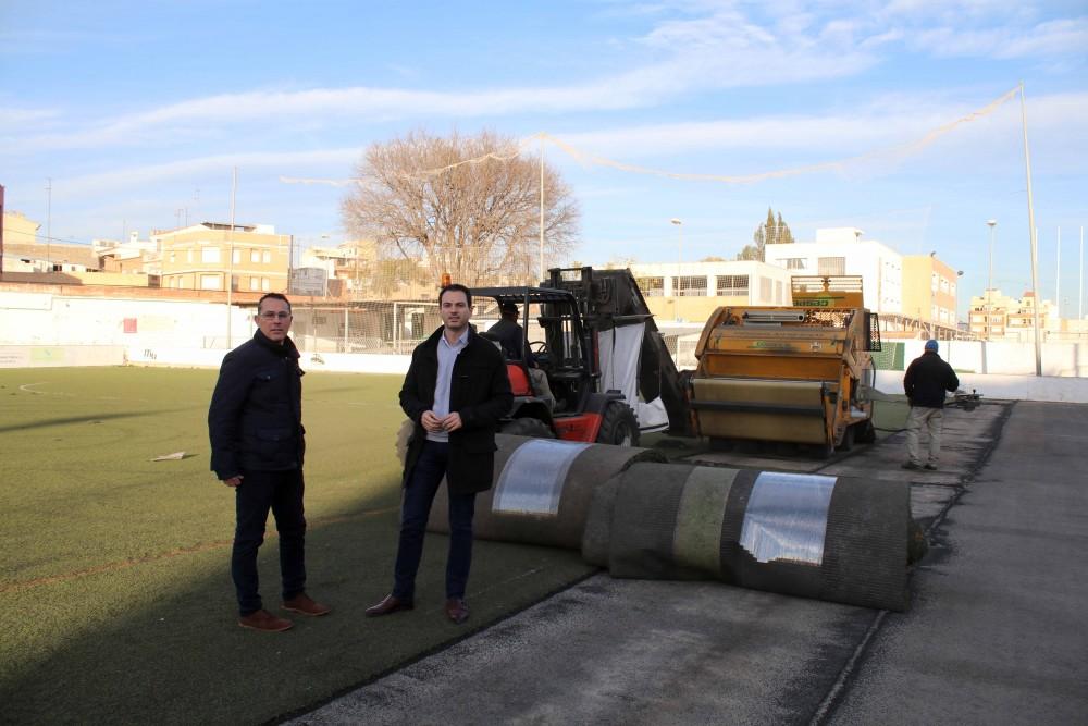 Onda, obra cambio césped ayuntamiento onda visita alcalde Ximo Huguet y concejal Deportes Francisco Chalmeta