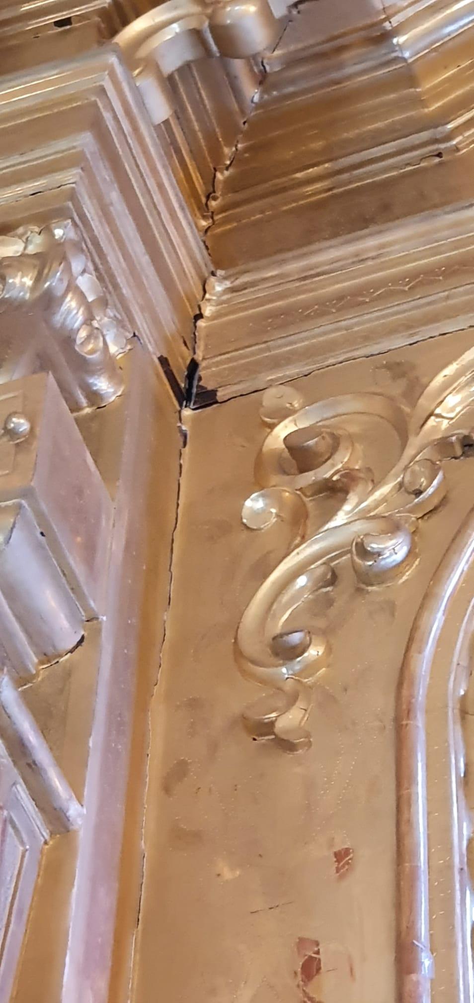 Así lo corroboró el técnico de la Diputación que examinó el retablo, concluyendo en su informe la necesaria actuación para frenar la degradación de la obra provocada por dos problemas: las grandes grietas producidas posiblemente por los movimientos que en el edificio se dan; y la pérdida de preparación y de estrato dorado, debido a la humedad que la madera absorbe.