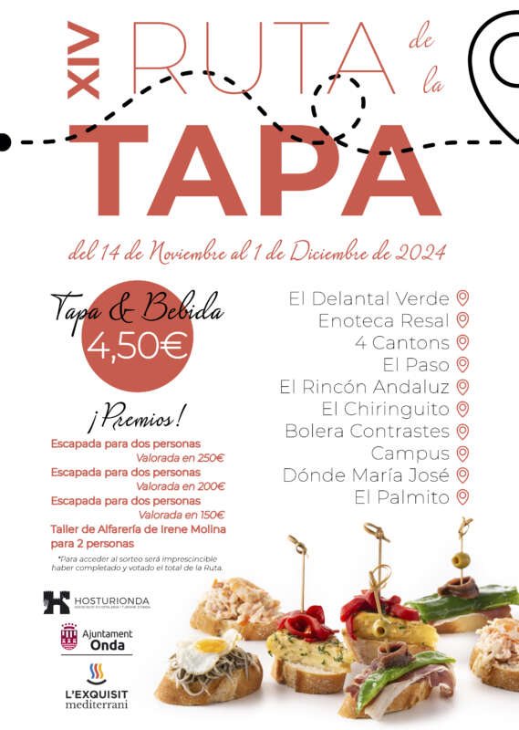 El tapeo vuelve a Onda con la XIV edición de la Ruta de la Tapa desde el 14 de noviembre al 1 de diciembre. El objetivo de la ruta es promover la hostelería de la localidad, dando a conocer su riqueza y variedad gastronómica y cultural.