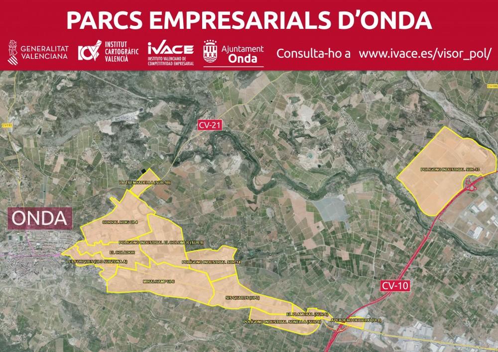 Onda compta amb 12 polígons que sumen 8 milions de metres quadrats amb tots els serveis propis d'una zona urbana industrial. Dins d'aquests es troben el subministrament de gas natural, enllumenat públic, aigua potable, clavegueram, connexió a la depuradora mancomunada, policia d'abocaments, recollida de RSU, campa de camions, ecoparc i manteniment de vials tant en neteja com en l'estat del ferm. En els últims anys l'Ajuntament d'Onda ha aprovat llicències d'obra major per valor d'11,5 milions d'euros i a la fi de juliol de 2018 s'han tramitat obres per import de 8 milions, per la qual cosa es preveu aconseguir entre 12 i 15 milions d'euros d'inversió privada enguany.