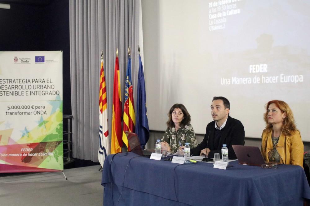 L'Ajuntament d'Onda ha explicat a la ciutadania els deu projectes que es cofinançaran gràcies als Fons Feder de la Unió Europea en una jornada a la qual han acudit associacions locals, empreses encarregades i públic en general, a més d'alguns ajuntaments de la província que han volgut conéixer les iniciatives que emprendrà el consistori amb aquestes ajudes. L'alcalde d'Onda, Ximo Huguet, ha sigut l'encarregat d'obrir aquesta jornada i ha explicat que “Onda és una ciutat que es desperta cada dia mirant al futur, marcant aquells reptes que queden per complir i que milloren la qualitat de vida de les persones. Prop de 25.000 veïns es mereixen una ciutat dinàmica, innovadora, inclusiva i amb més oportunitats. Volem continuar avançant i escoltant a la ciutadania, per això fixem la mirada a Europa i quan iniciem les labors de govern a l'inici d'aquesta legislatura, elaborem una Estratègia de Desenvolupament Urbà Sostenible i Integrada (EDUSI) que ha servit per a cridar l'atenció de la Unió Europea que destinarà 2,5 milions a finançar el 50% de projectes per a transformar la nostra ciutat i fer-la més moderna, habitable i sostenible”.