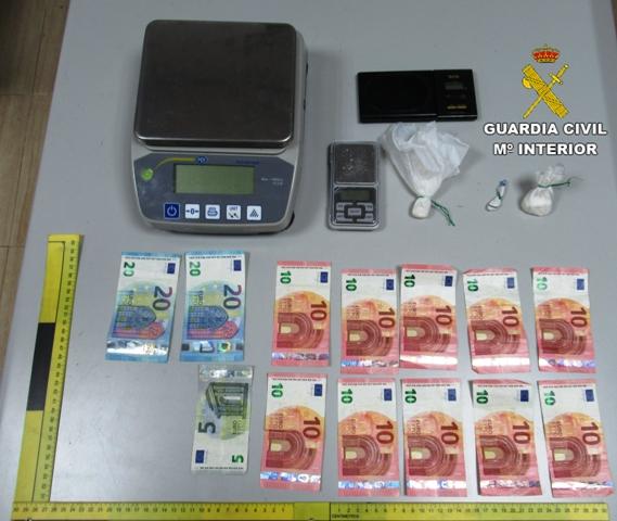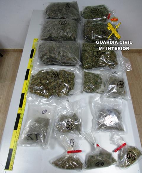 Por dicho motivo los guardias civiles iniciaron una investigación que dio como resultado la identificación de su morador y tras efectuar un registro domiciliario debidamente autorizado, se incautaron de 15 gramos de cocaína, casi 3 Kilogramos de marihuana, bolsas de plástico, varias básculas y dinero en efectivo.