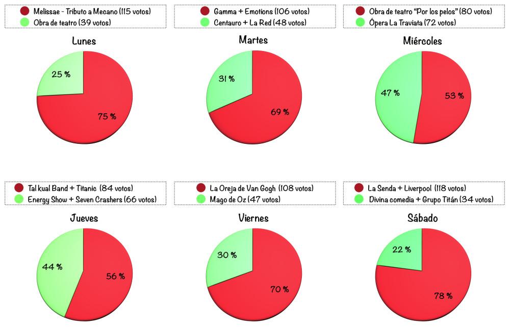- Miércoles 30 de agosto: Obra de teatro "Por los pelos", con 80 votos, frente a los 72 de la representación de La Traviata.