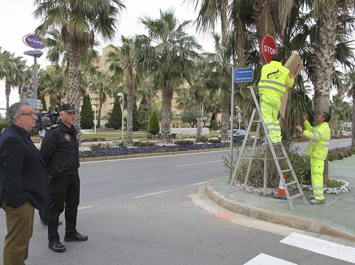El alcalde Rafael Albert, acompañado del Intendente Principal de la Policía Local ha comprobado cómo los trabajadores han colocado las nuevas señales verticales, que han empezado a funcionar esta misma semana.