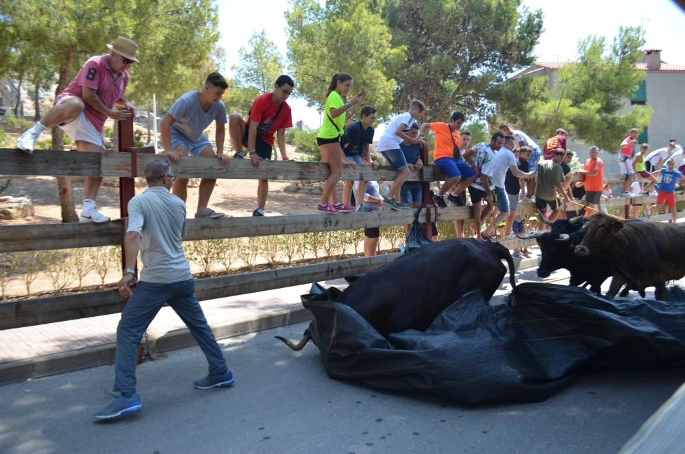 Cinco horas después, sobre las 13.00 horas, ha tenido lugar el segundo de los encierros de esta jornada. Los aficionados taurinos se han agolpado tras las barreras y, después de que los organizadores colocaran el toldo en el recorrido, las reses han salido de los corrales con una sorpresa preparada para el público. Y es que los astados, en esta ocasión, no se han dado la vuelta en la lona instalada, sino que la han saltado, provocando los gritos de emoción en buena parte de los asistentes. Poco después, los aficionados se han trasladado hasta el interior de la plaza de toros para disfrutar de la prueba de toros y vaquillas de la ganadería Alberto Garrido.