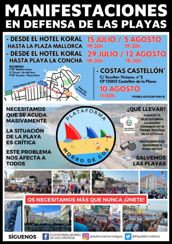 Desde allí, vecinos de la zona y veraneantes con segundas residencias en el municipio partirán hasta la plaza Mallorca para lanzar un mensaje claro y directo: la necesidad de una acción inmediata para salvar la playa Morro de Gos. "Hay que actuar rápido. El Ayuntamiento debe presionar a Costas para que se haga algo de manera urgente", exigen desde la plataforma.