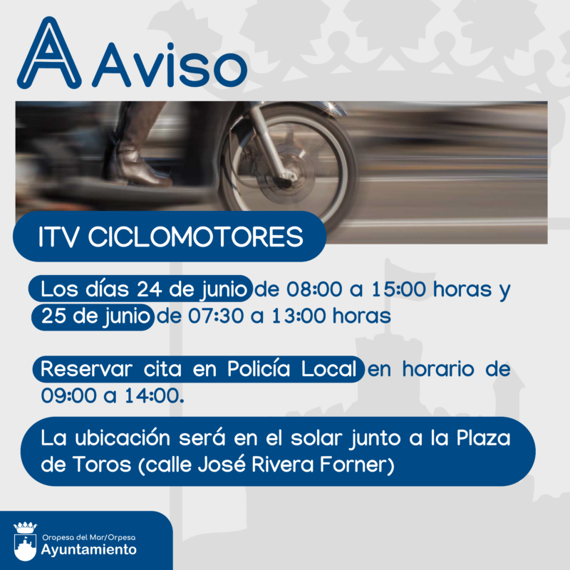 El Ayuntamiento de Oropesa del Mar ha colaborado junto a la entidad responsable de las inspecciones técnicas de vehículos para coordinar el desplazamiento de una ITV móvil a la localidad los próximos días 24 y 25 de junio. Esta medida surge con el objetivo de facilitar a las personas propietarias de ciclomotores la revisión obligatoria cada dos años.