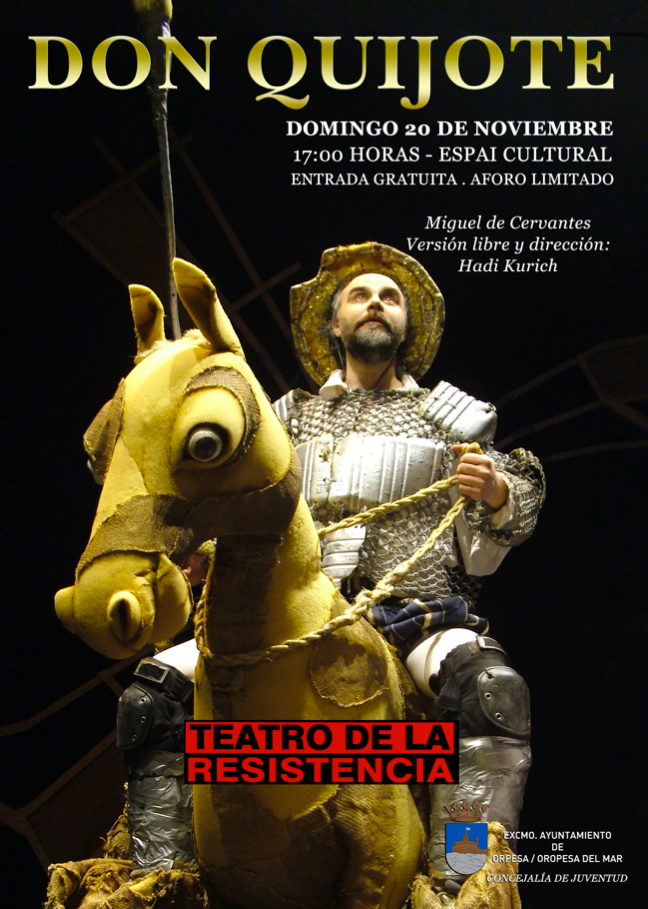 El Espai Cultural de Oropesa del Mar ofrece este domingo, a las 17.00 horas, la obra de teatro ‘Don Quijote’, representada por la compañía Teatro de la Resistencia y basada en una versión libre del libro de Cervantes.