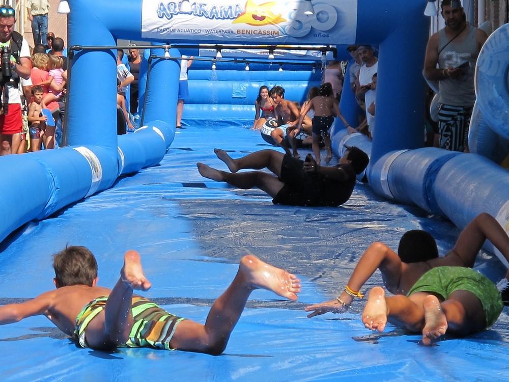 La calle Ramón y Cajal ha sido ocupada, prácticamente en su totalidad, por un tobogán acuático gigante en el cual los más atrevidos se han deslizado con colchonetas hinchables o sin ellas, a lo largo de los 80 metros de longitud.