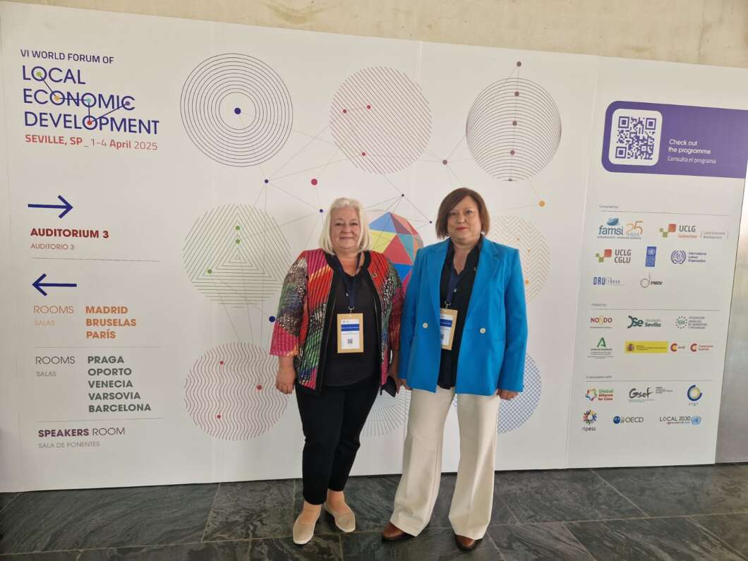 La alcaldesa de Oropesa del Mar, Araceli De Moya, y la técnica del área de Empleo, desarrollo local, Comercio, Emprendedores e innovación, María Segura, han participado en el VI Foro Mundial de Desarrollo Económico Local, celebrado otros años en diferentes países de Europa, y que este año se celebra en la ciudad de Sevilla.
