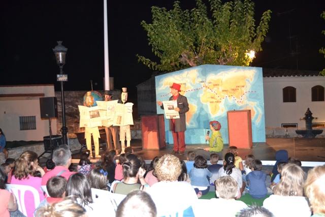 La compañía de teatro Mutis representó en la noche de ayer el espectáculo ‘La vuelta al mundo en 80 días’, dentro del ciclo de actuaciones que la Concejalía de Cultura de Oropesa ha programado todos los miércoles de verano en la plaza de la Iglesia, dedicadas especialmente al público infantil.