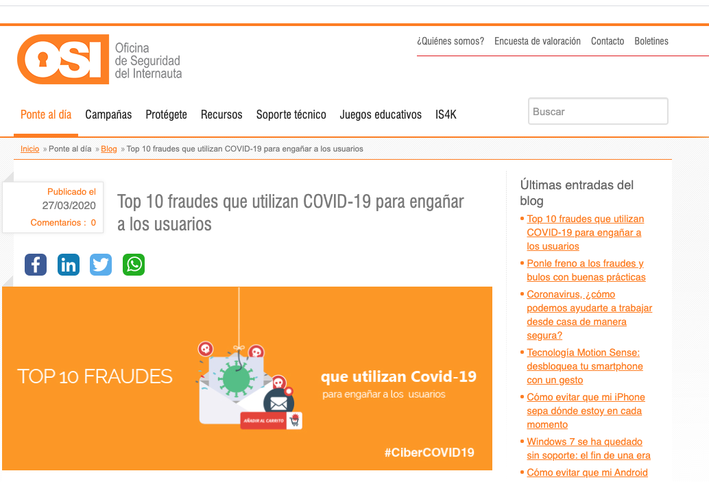 La Oficina de Seguridad del Internauta informa que: Ante la crisis sanitaria mundial debido al COVID-19, es de esperar que haya quien quiera aprovecharse y sacar un beneficio económico de todo esto. Los ciberdelincuentes no descansan y siempre encuentran nuevas formas de llevar a cabo sus estafas y fraudes online, por eso hemos elaborado un top 10 de los fraudes más utilizados por los ciberdelincuentes sobre el coronavirus.
