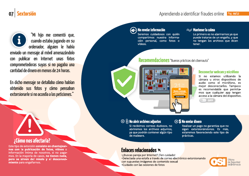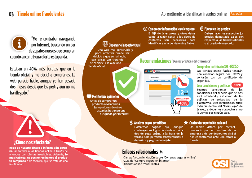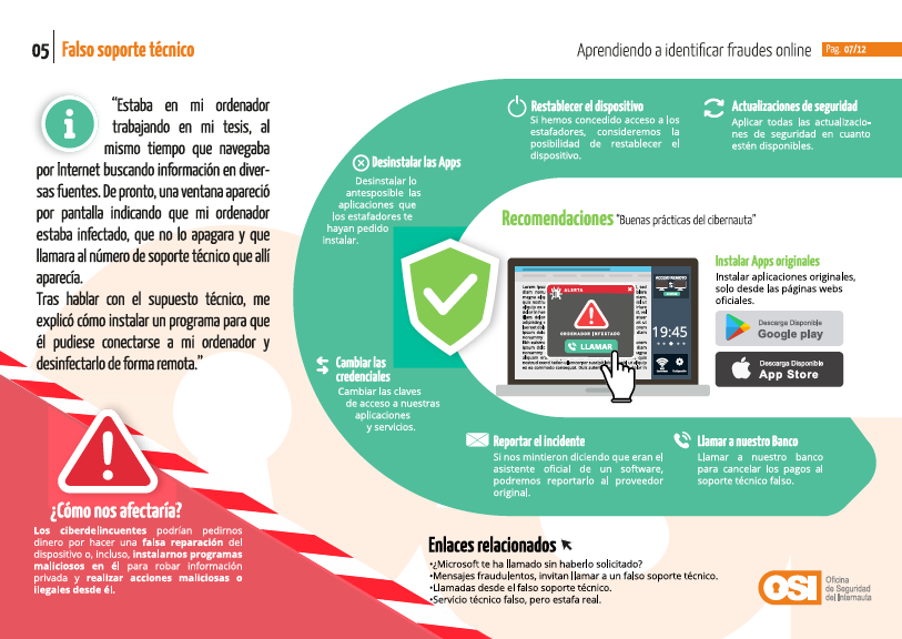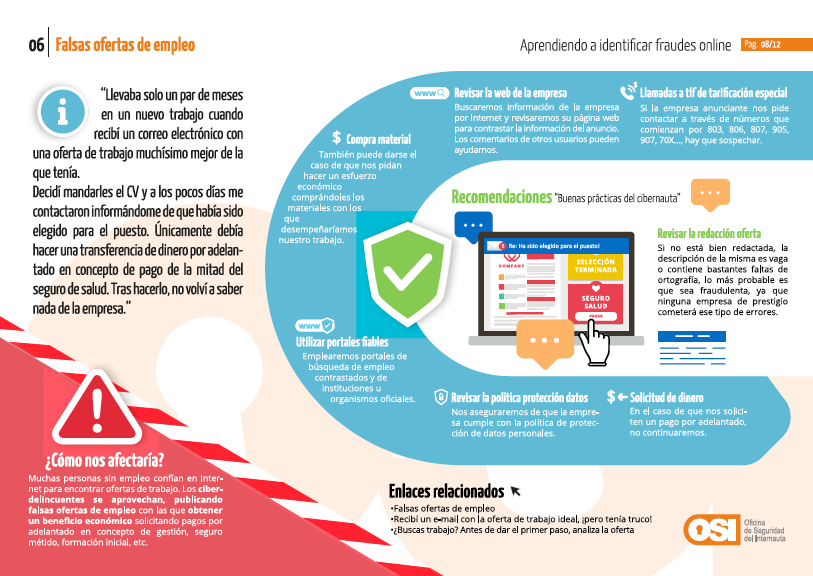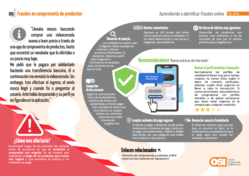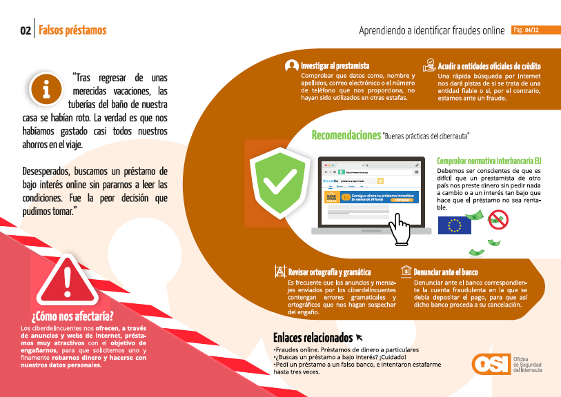 La guía puede bajarse gratuitamente a través dl enlace de OSI. En ella, el usuario encontrará 9 fichas que describen 9 casos de fraude en concreto, como phishing, falsos préstamos, tiendas online fraudulentas, falsos alquileres, falso soporte técnico, falsas ofertas de empleo, sextorsión, perfiles falsos y fraudes en compraventa de productos.