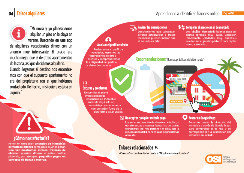 Otro fraude que se produce mucho más habitualmente de lo que pareces, es aquel que se produce cuando el usuario busca alquilar una vivienda de verano o para todo el año en la red. En situaciones como esta y tal como recomienda OSI, hay que ser muy cauto con este tipo de anuncios, revisar a fondo las condiciones y no adelantar pagos alegremente.