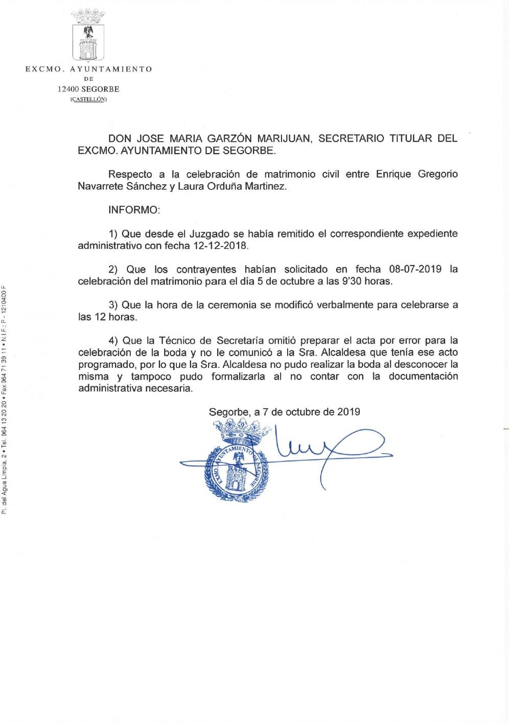 El PSOE de Segorbe denunció ayer que una pareja acudió a celebrar su matrimonio civil al Ayuntamiento el sábado y lo encontró cerrado y atribuyó el hecho a una perdida de documentos.