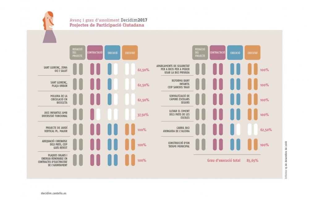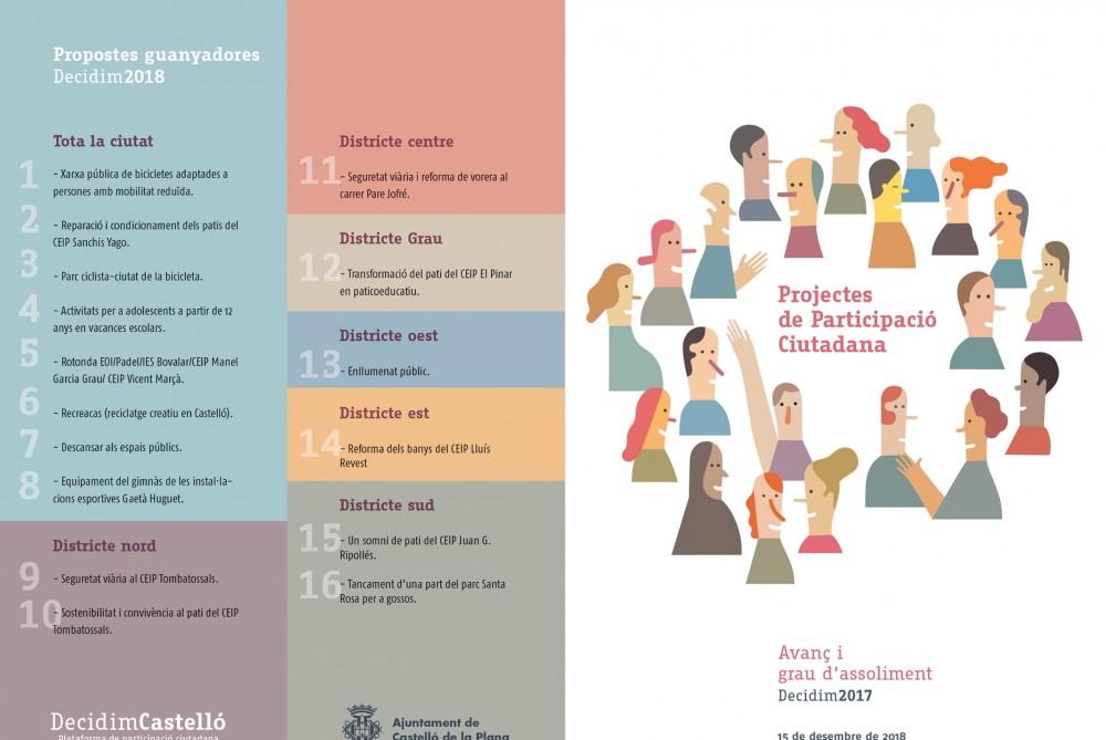 "Pel que fa a les propostes que s'han executat durant aquest any, que feien referència als pressupostos de Decidim 2017, s'han assolit amb totalitat 8 projectes, que representen un 83,65% del total de propostes" ha afirmat la vicealcaldessa. D'altra banda, les 5 propostes restants es troben en procés d'execució. "Estem molt satisfets de la feina realitzada, ja que els mateixos ciutadans i ciutadanes els que han elegit en què invertir els diners dels pressupostos participatius per tal de millorar la ciutat de Castelló", ha manifestat el regidor de Modernització, Ignasi Garcia.