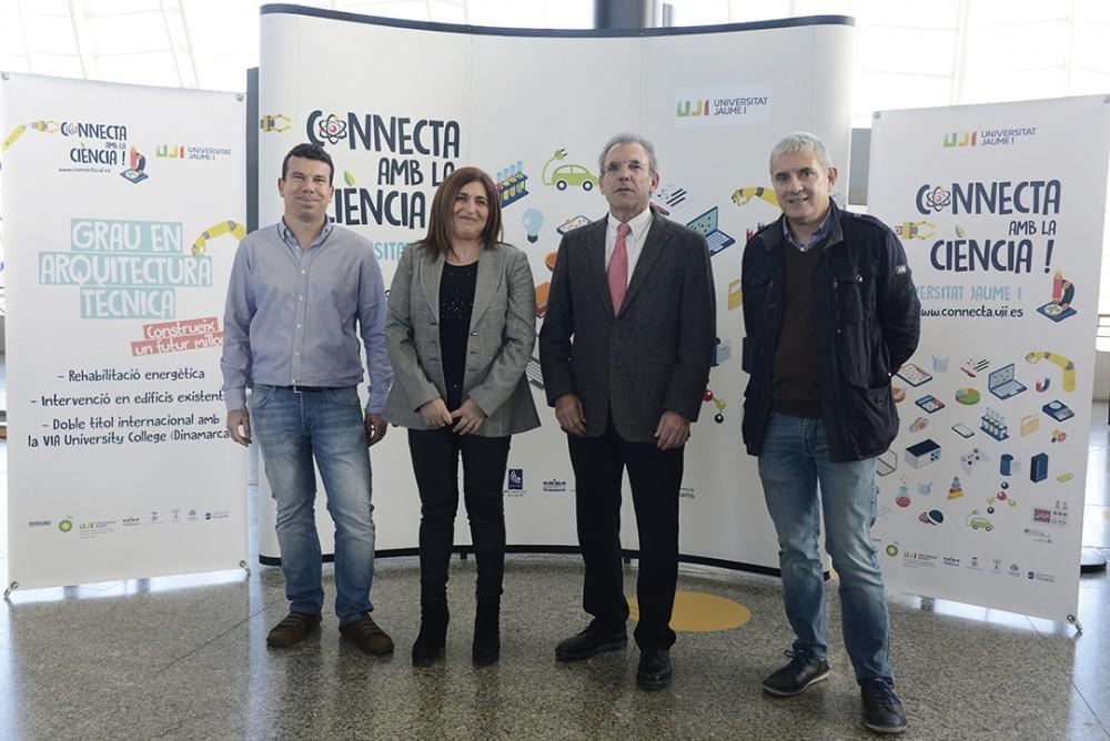 El director general de la Ciutat de les Arts i les Ciències, Enrique Vidal; la directora de l'Escola de Tecnologia i Ciències Experimentals de la Universitat Jaume I de Castelló, Amèlia Simó; el responsable del Projecte de Cultura Científica i Ciència Ciutadana de l'UJI, Lluis Martínez, i el professor de Química Inorgànica i Orgànica de l'UJI, Eduardo Peris, han clausurat els tallers científics que s'han celebrat aquest mes en el Museu de les Ciències i que són una mostra dels que es realitzen en les Jornades Científiques 'Connecta amb la Ciència' de l'UJI.