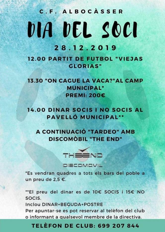 El Club de Futbol Albocàsser celebrarà el dissabte 28 de desembre el Dia del Soci. A les 12h tindrà lloc el partit de "velles glòries" i a les 13.30h es durà a terme l'activitat "on cague la vaca?" en el camp municipal amb un premi de 200 euros. El dinar per a socis i no socis serà a les 14h en el pavelló municipal. La jornada continuarà amb un tardeo i música amb la discomòbil The End.