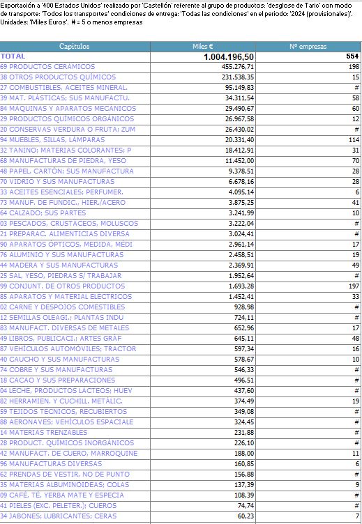 A continuación se muestra un cuadro con los principales sectores por capítulos exportados ofrecidos por la Cámara de Comercio de Castellón.