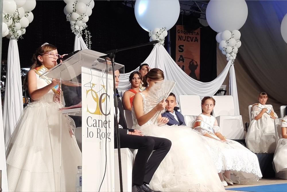 La música interpretada por la Agrupación Musical Santa Cecilia de Canet Lo Roig, con Miguel Joaquin Selva Pla a la batuta, fue la banda sonora que acompañó a las nuevas dignatarias en su desfile hasta el escenario. Allí, Paula y Claudia recogieron el testigo de sus antecesoras en el cargo -la joven Mariona Bengochea y la niña Selena Vallés-, que fueron las encargadas de imponerles la banda y la corona.