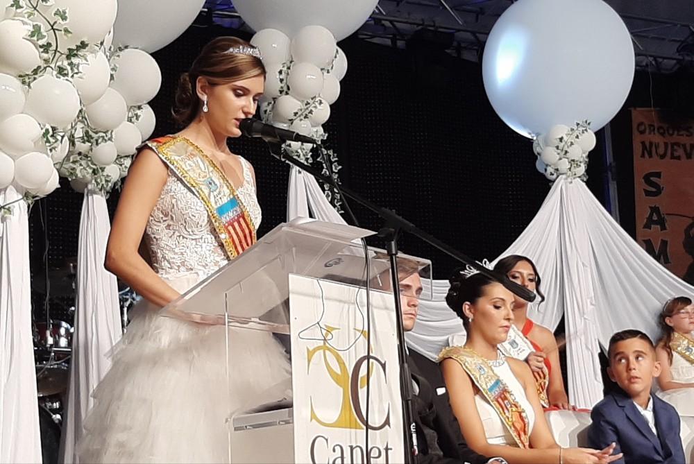 Acto seguido tomó la palabra la alcaldesa, María Ángeles Pallarés y, en su parlamento, aderezado con algún simpático guiño al respetable, verbalizó sus nobles sentimientos hacia su pueblo y su gente. Pallarés aseguró que Canet Lo Roig "es el mejor pueblo dónde vivir y crecer" y reiteró su firme compromiso de seguir construyendo, "todos juntos, un próspero futuro lleno de oportunidades, solidaridad y hermandad". Por último, invitó a todos, "niños, jóvenes y mayores, a disfrutar al máximo de las Fiestas".