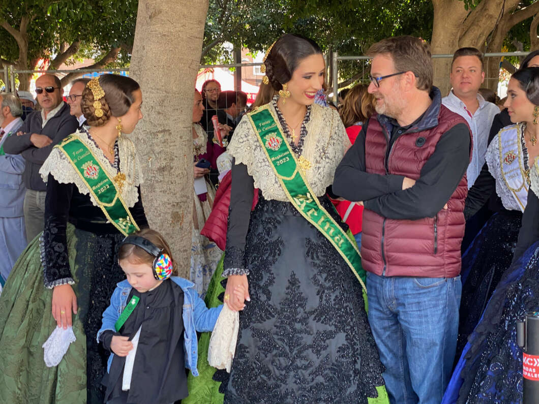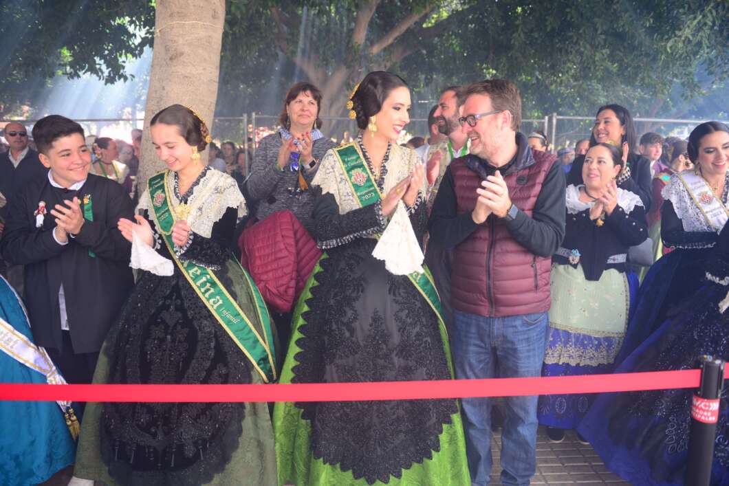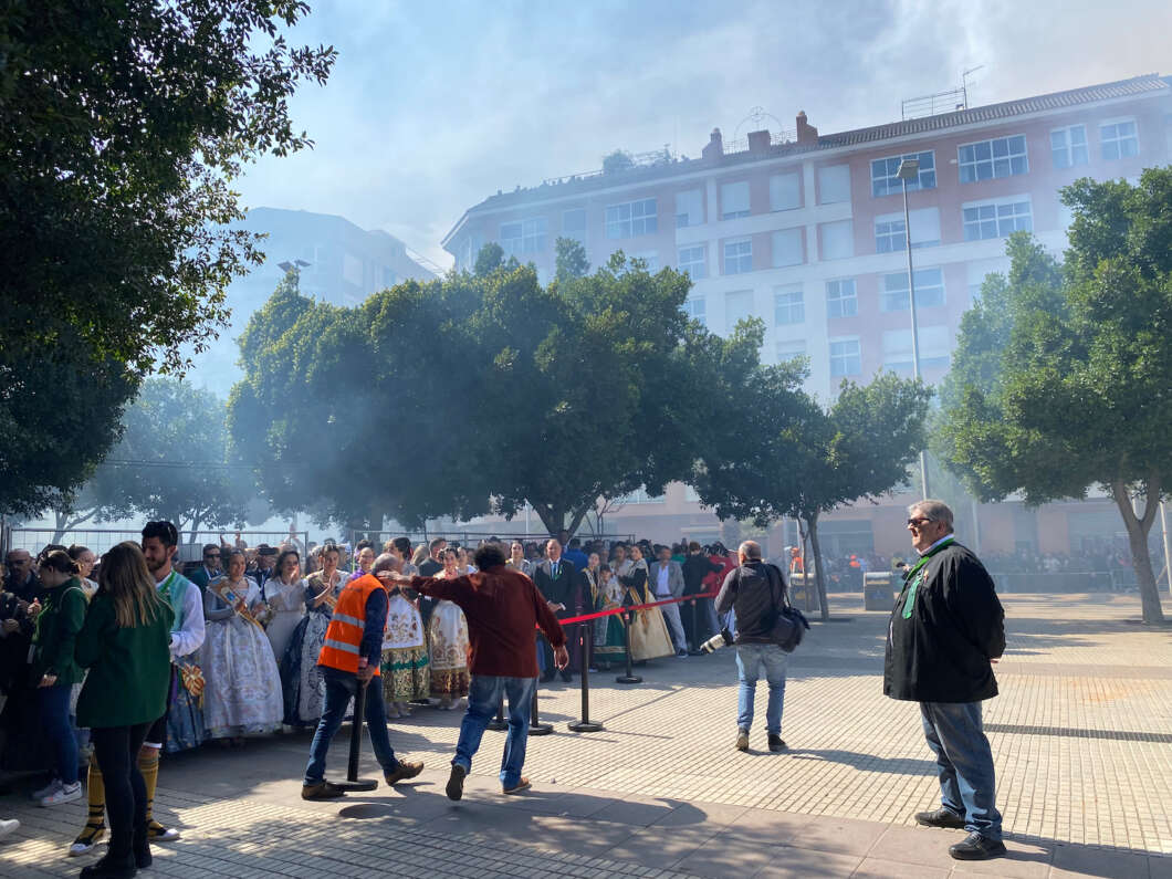 Tras el estallido del último trueno de aviso las reinas, Selene tarín y Alejandra Sáez, en compañía de los pregoneros 2023 prendieron la mecha y comenzó la traca que había de enlazar con el cuerpo de la mascletá.