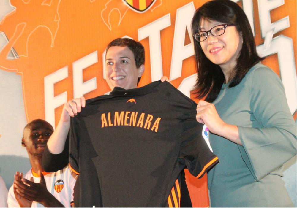 La alcaldesa de Almenara, Estíbaliz Pérez, presente en el acto ha agradecido la presencia del Valencia C.F. en la localidad, así como “la apuesta realizada con la fiesta de la afición” invitando de nuevo al club valencianista a volver hasta el municipio. De hecho, la presidenta Layhoon Chan ha recordado en su alocución que era la segunda ocasión ya en que visitaba Almenara, la localidad natal de Jaume Doménech. El Valencia C.F. ha entregado una camiseta del club a la alcaldesa, y desde Almenara se ha entregado una caja de naranjas Torres a los jugadores y la presidenta valencianista.