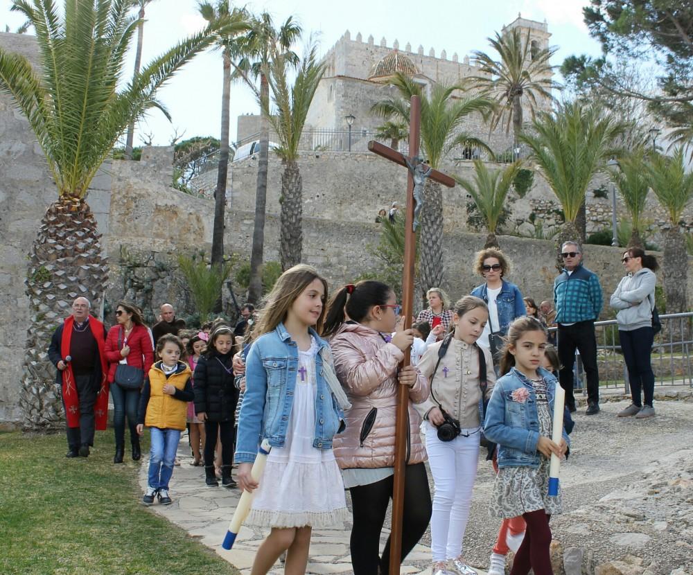 Los niños y niñas que siguen la catequesis previa a la Primera Comunión participaron ayer en la mañana en el Vía Crucis Infantil que se celebró con motivo del Viernes Santo en Peñíscola, organizado por la Parroquia de Santa María. En él se siguieron las catorce paradas de rigor ubicadas desde la Iglesia hasta los Jardines del Castillo.