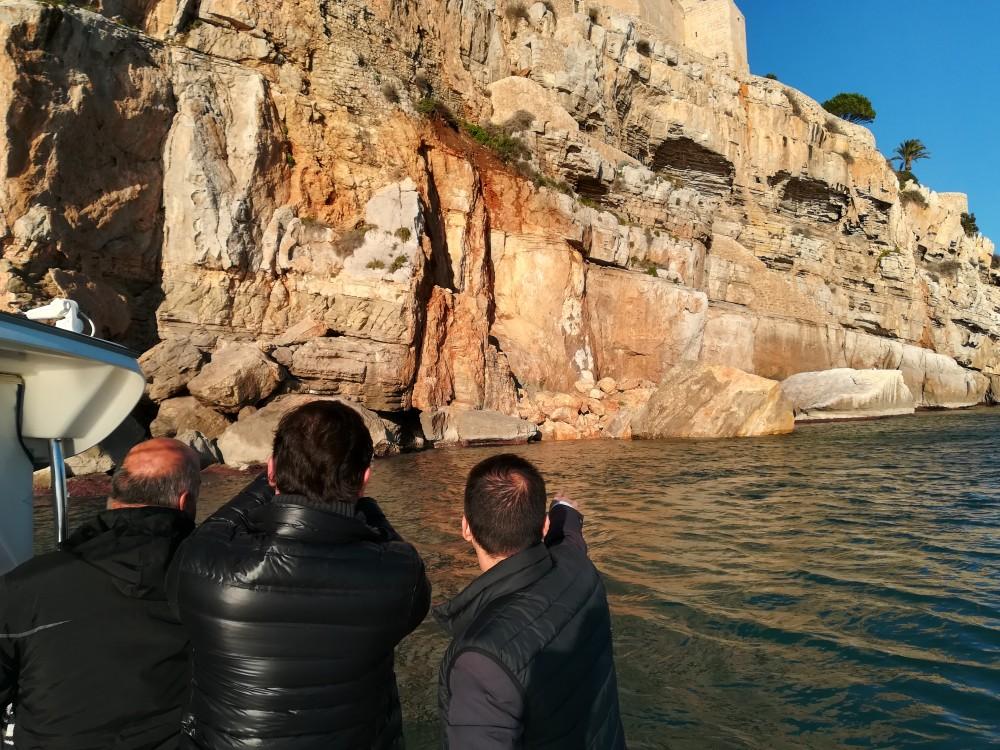 En una embarcación de recreo han podido visitar toda la zona rocosa sobre la que se asienta la ciudadela amurallada de la ciudad, pudiendo comprobar el estado de la zona que ha sufrido los desprendimientos estos días, coincidiendo con un importante temporal marítimo.