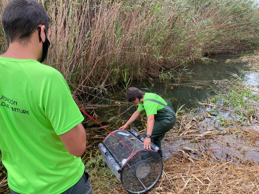 La Fundación Global Nature comenzó la semana pasada la realización de labores de campo para prospectar la fauna de la acequia. Sus especialistas han colocado diversas redes para el monitoreo y captura controlada de galápagos en el entorno de la acequia Sangonera.