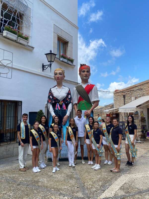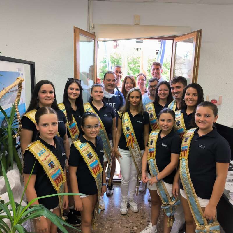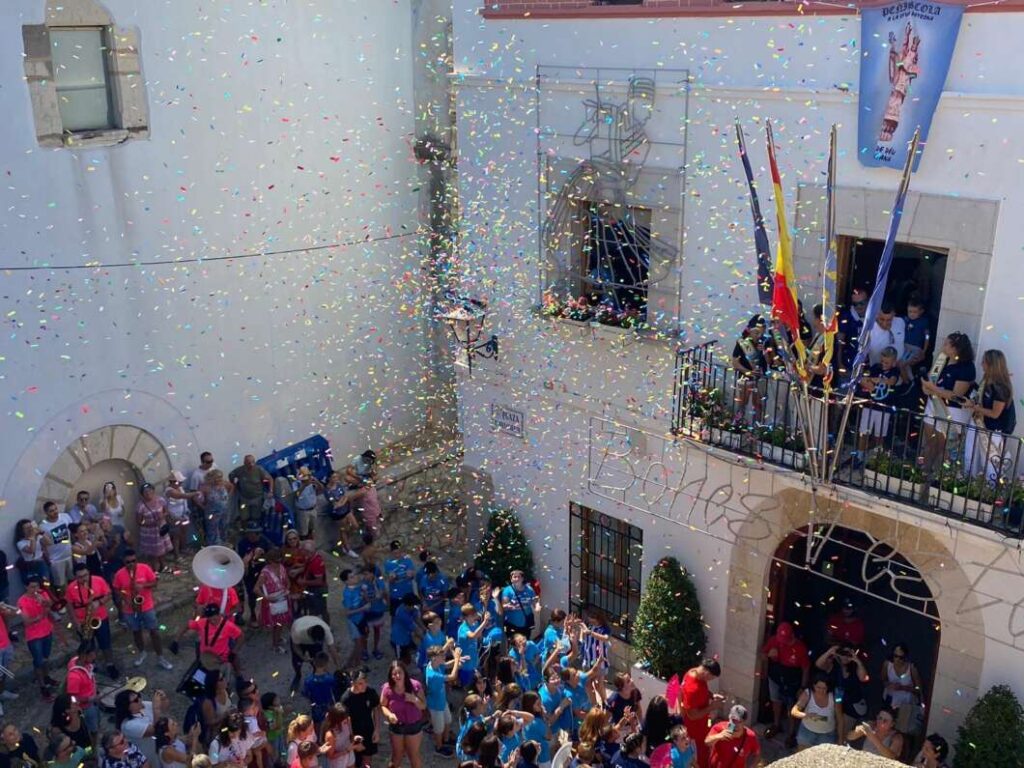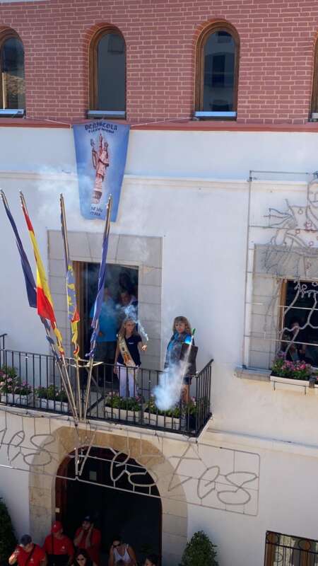 Peñíscola ha arrancado este sábado sus fiestas patronales con el volteo general de campanas y los tradicionales cohetes anunciadores. La reina 2023, Isabel Marqués, junto a su corte de honor, se ha despedido desde el balcón del Ayuntamiento acompañada por el alcalde, Andrés Martínez, y el concejal de Fiestas, Ramón Simó.