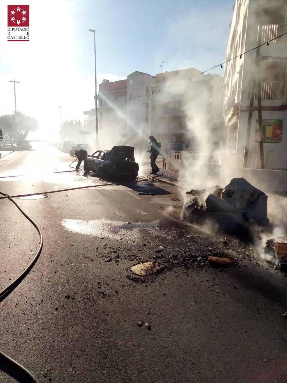Un incendio producido a primera hora de esta mañana afecta a cuatro contenedores y un vehículo estacionado que acaban calcinados en la Avenida Estación de Peñíscola.
