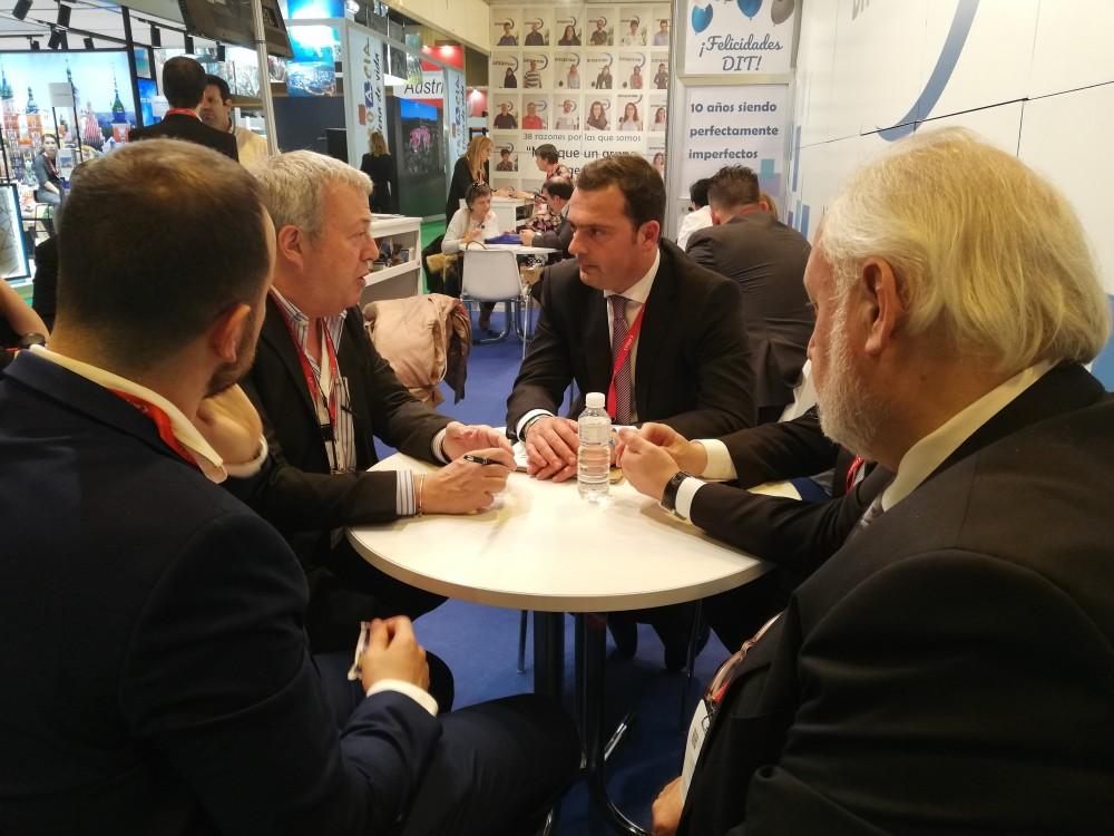 Uno de los encuentros habituales en feria es con representantes de agencias de viajes minoristas y mayoristas, así como touroperadores. En la imagen, Martínez, en uno de los grupos de agencias del país junto al Presidente de la Federación de Asociaciones de Agencias de Viaje de la Comunidad Valenciana (FAV), Salvador Amorós, programando acciones de promoción del destino en los puntos de venta y distribución. Durante el encuentro se ha puesto también sobre la mesa la posibilidad de programar nuevos viajes de familiarización.