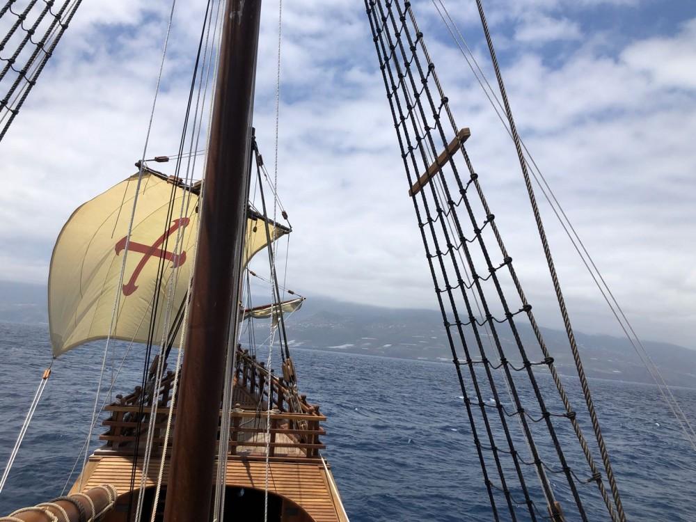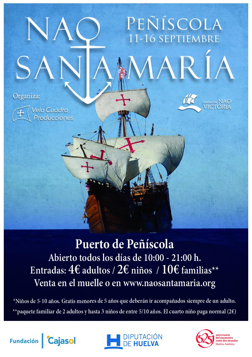 cartel_nao_sta_maria_peniscolaEsta magnífica réplica ha sido construida a tamaño real de 200 toneladas, 29 m. de eslora y 8 m. de manga, cuatro palos, cinco velas y cinco cubiertas, en madera de iroko y pino. Tras su visita a Peñíscola, en el mes de octubre, cruzará el Atlántico hasta costas americanas, donde visitará Puerto Rico, Cartagena de Indias y La Habana.