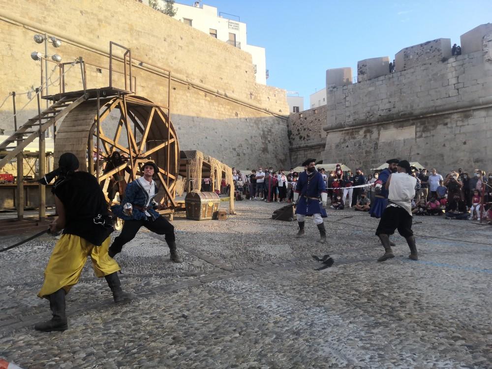 Esta tarde se ha llevado a cabo la primera performance en la Plaza de Bous bajo la temática 'Aventuras y piratas'. Con el escenario de rodaje atrezzado y decorado, 'La rueda del infierno' ha mostrado a los espectadores cómo se desarrolla un rodaje en vivo.