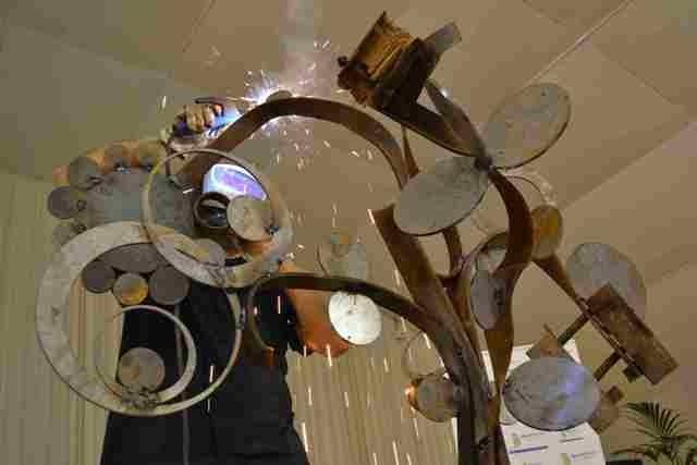 Por la mañana tuvo lugar el taller infantil de peces de colores con Leonardo D. Ghebaru que recibió la visita del Consul de Rumanía, que aprovechó para visitar todo el recinto y departir con los artistas y, especialmente, con el creador rumano Augustin Ghebaru. A continuación Pablo D’Antoni realizó la segunda sesión de su taller de pintura en inglés (patrocinado por LITTLE ARTIST). A primera hora de la tarde el padrino Pere Ribera inició en directo la escultura en chatarra ‘Sueños reciclados’, un árbol de los sueños que fomenta el reciclaje pero también el poder creador. Durante tres horas el artista de la Vall y su ayudante levantaron la escultura ante los atentos ojos del público que reconoció el esfuerzo al que se sometió el artista.