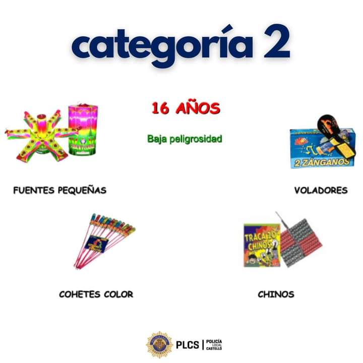 -Categoría 2 (baja peligrosidad), a partir de los 16 años: chinos, fuentes pequeñas, voladores, cohetes de color…