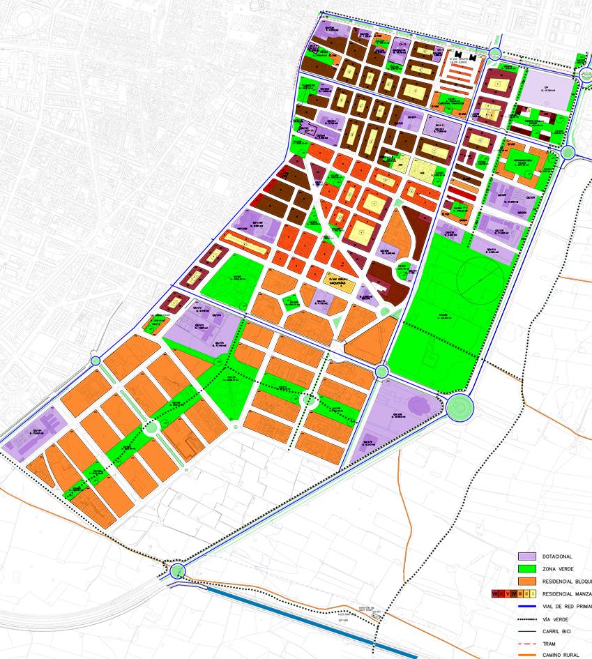 Las nuevas zonas de suelo residencial urbanizable se redistribuyen respecto a las planteadas en el PGOU de 2000, suprimiendo un sector que se delimitaba al borde de la ronda de circunvalación y delimitando una nueva pastilla residencial de tipología de baja intensidad entre la avenida Chatellerault, la plaza del Cometa Halley y la futura zona verde.
