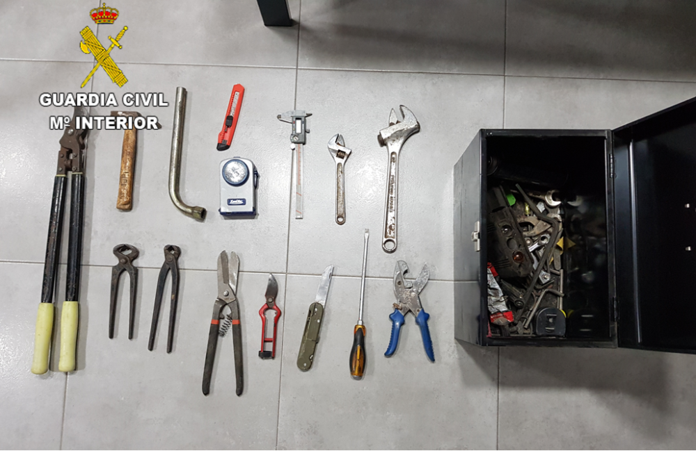 Posteriormente tras realizar una inspección del vehículo, los agentes hallaron efectos destinados para la comisión del hecho delictivo, tales como tijeras, alicates, martillos, cizallas y un cuchillo entre otros efectos.