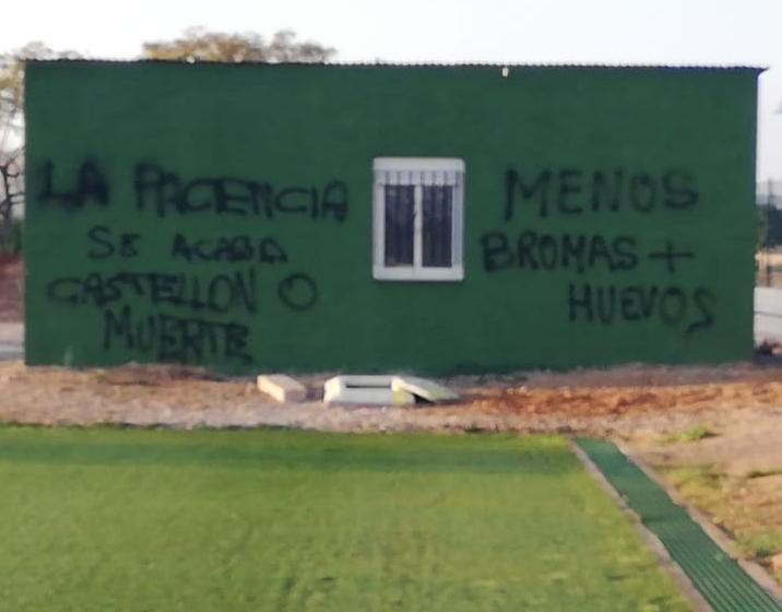 Una caseta de la instalación de uno de los dos campos de fútbol de Marina d'Or, donde habitualmente entrena el Castellón, ha aparecido esta mañana con pintadas con frases destinadas a la plantilla del conjunto castellonense. En ellas se podía leer dos frases que decían "la paciencia se acaba. Castellón o muerte" y "menos bromas + huevos". Hay que recordar que la crispación va en aumento en un sector de la afición albinegra, con el equipo en puestos de descenso y a cuatro puntos de la salvación, a falta de trece partidos para la conclusión del campeonato. El Castellón, tras descansar el martes, regresó este miércoles al trabajo en doble sesión. La primera ha tenido lugar en uno de los dos campos de Marina d'Or, Esta tarde tendrá lugar la segunda sesión de entrenamiento, en el otro campo de la instalación deportiva de Orpesa del Mar.