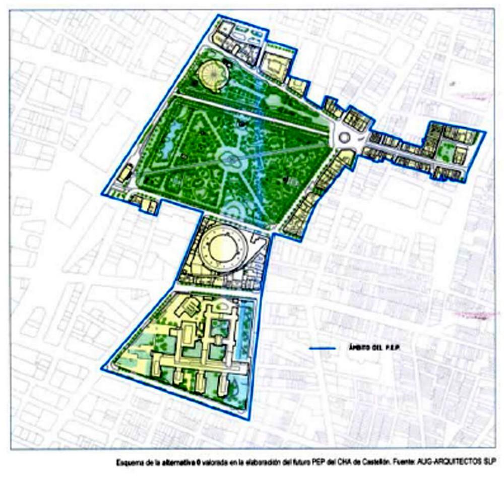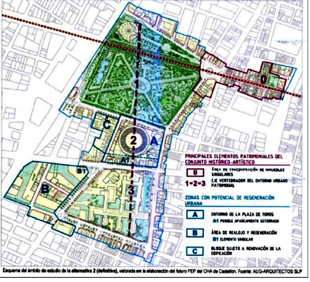 Alternativa 2 2015La Alternativa 2, que es la finalmente propuesta por el equipo de estudio, se fundamenta en dos actuaciones principales: La incorporación de manzanas residenciales no totalmente consolidadas, situadas en la zona oeste del Hospital Provincial y la plaza de Toros. Se propone el derribo  de las construcciones que circundan la plaza de toros. Por otra parte, legalizaría las actuaciones  del acondicionamiento del Paseo de coches del Parque Ribalta, todo lo que constituye la pasarela del Tram y las obras que lo complementan, y daría soporte legal, también al paso del Tram por el interior del parque.