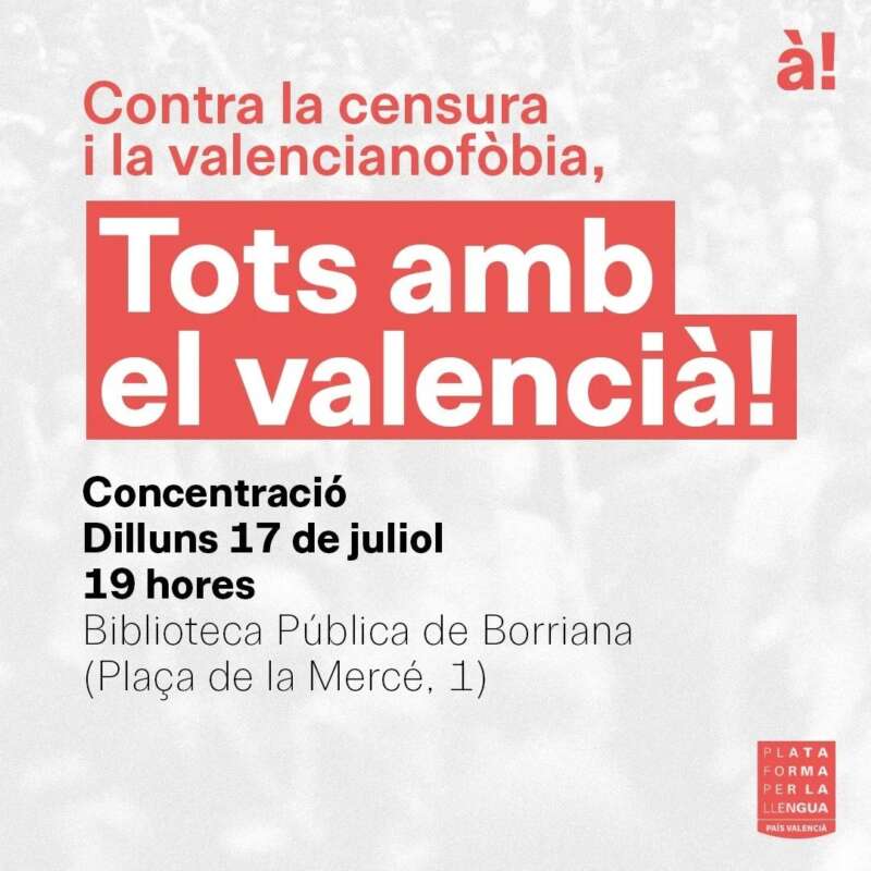 Plataforma per la Llengua ha convocat una concentració a Borriana “contra la valencianofòbia del govern municipal”. La concentració tindrà lloc el proper dilluns, 17 de juliol, a les 19:00 hores, davant de la Biblioteca Municipal de Borriana després de que el govern municipal tractara de retirar la subscripció a les revistes ‘El Temps’, ‘Camacuc’, ‘Sàpiens’, ‘Enderrock’, ‘Llengua Nacional’ i ‘Cavall Fort’. Després de que la notícia aplegara a ser ‘Trending Topic’ a Twitter, l’ONG del valencià ha fet una crida a la ciutadania sota el lema ‘Tots amb el valencià!’.