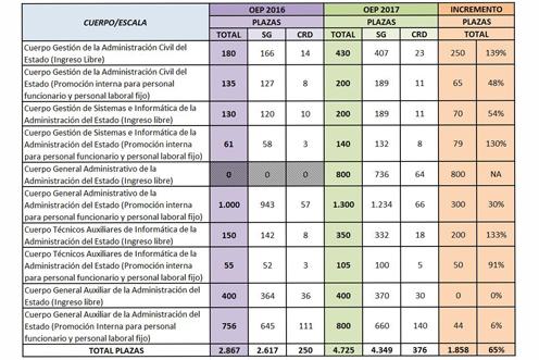 La Administración General del Estado ha convocado hoy los procesos selectivos para cubrir un total de 4.725 plazas en cuerpos generales del Estado, correspondientes a la Oferta de Empleo Público de 2017. Esta convocatoria supone un incremento del 65% sobre las 2.867 plazas ofertadas en la anterior.